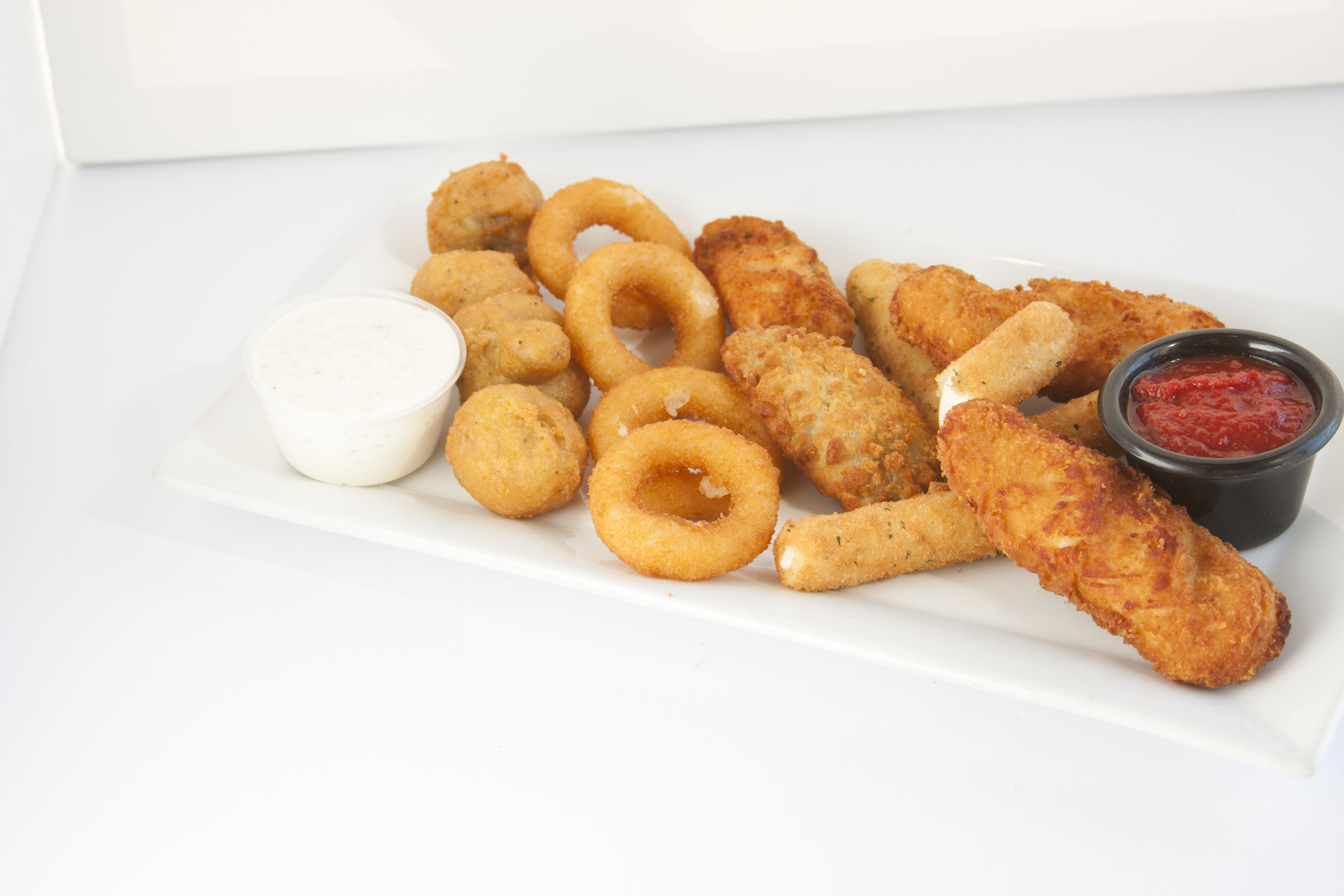 5 Onion Rings, 5 Breaded Mushroom, 2 Chicken Fingers, 2 Jalapeno Peppers, 2 Mozzarella Sticks