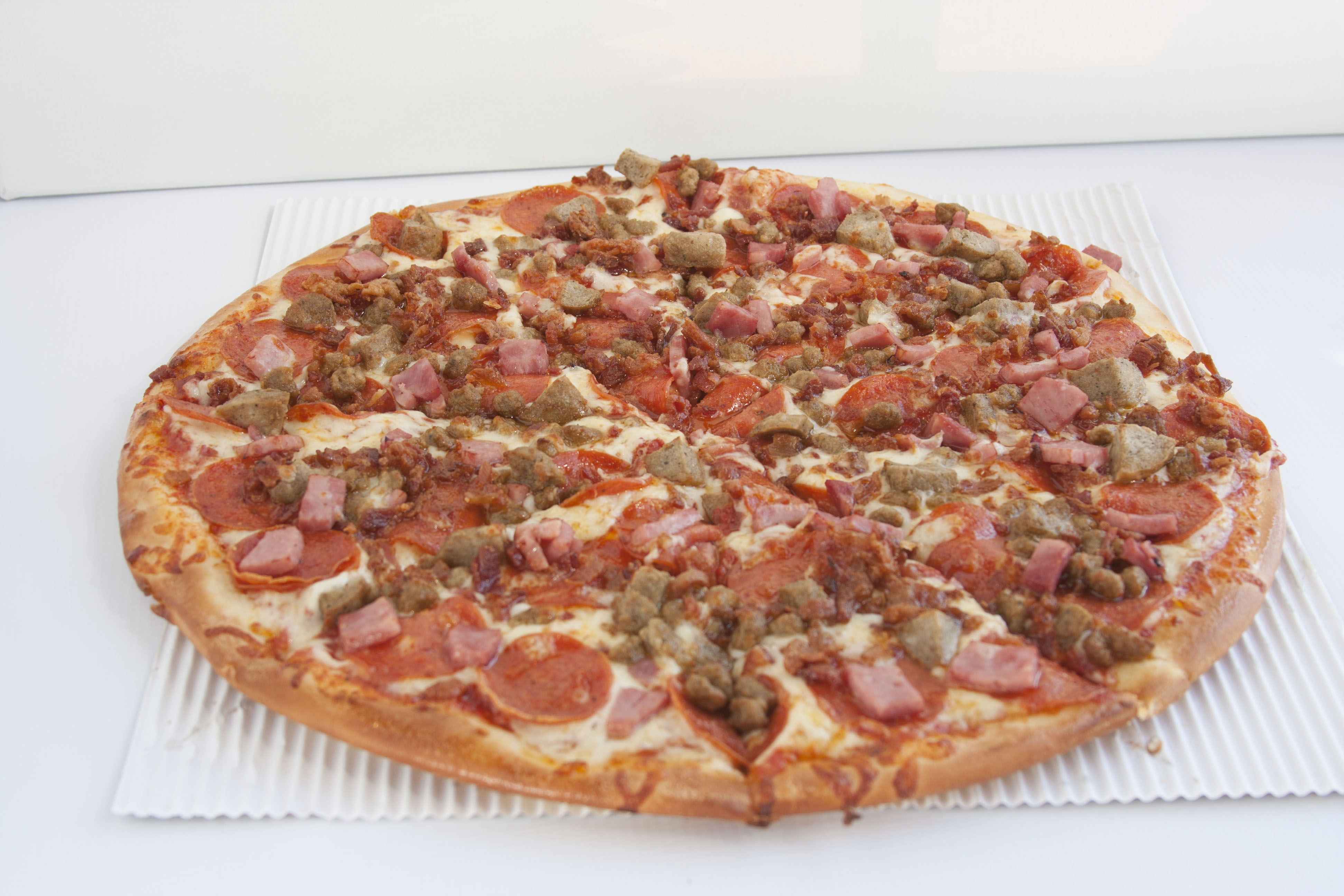 Regular Crust, Pizza Sauce, Pizza Cheese, Imported Ham, Sausage, Meatballs, Pepperoni and Bacon.
