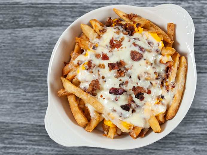 Provolone, Chicken, Ham, Provolone Cheese, Blue Cheese and Waffle Fries.