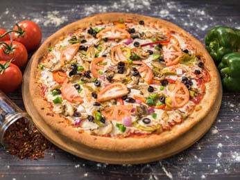 Regular Crust, Pizza Sauce, Pizza Cheese, Mushrooms, Sweet Peppers, Black Olives, Tomatoes, Green Peppers and Onions.